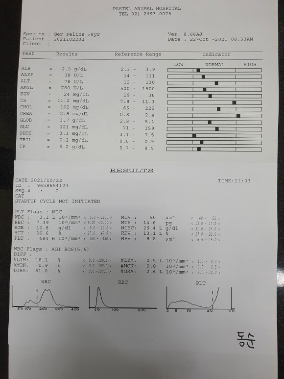 2021년 9월 11일에 이사를 하면서 어수선한 분위기와 주변 환경 때문인지 동순이가 말라깽이가 되어가는 것이 이상해서 병원에 가서 검사를 하게 되었다. 평소 몸무게가 6~7키로를 왔다갔다 하는데 당시에는 4키로대... 거의 3키로가 빠져있었다.